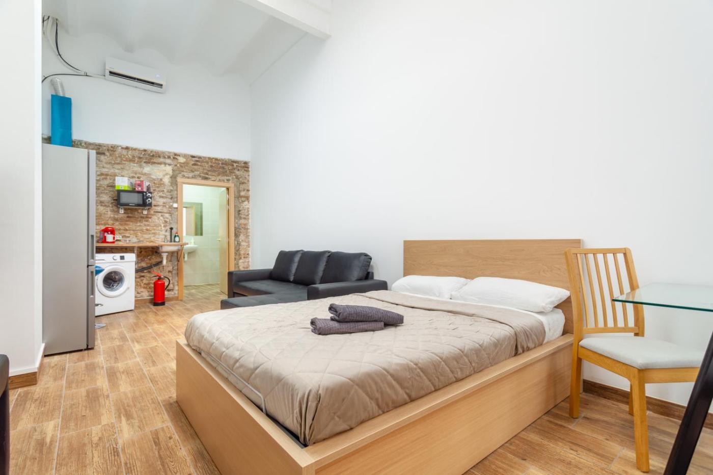 Estudio Superior. Este estudio dispone de baño privado con ducha, secador de pelo y artículos de aseo gratuitos. La cocina está bien equipada con nevera, utensilios, microondas y teteracafetera. El estudio cuenta con aire acondicionado, zona de comedor, TV de pantalla plana con canales por cable, lavadora y balcón. Incluye 2 camas. ;