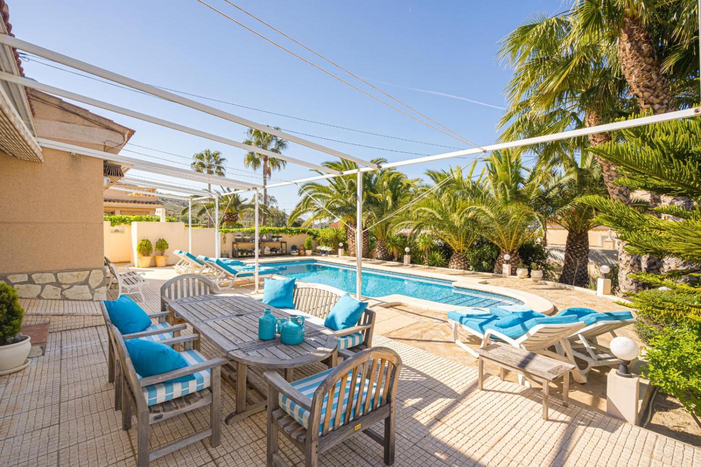 La villa cuenta con 3 dormitorios, 2 baños, ropa de cama, toallas, TV, cocina totalmente equipada y terraza con vistas a la piscina.