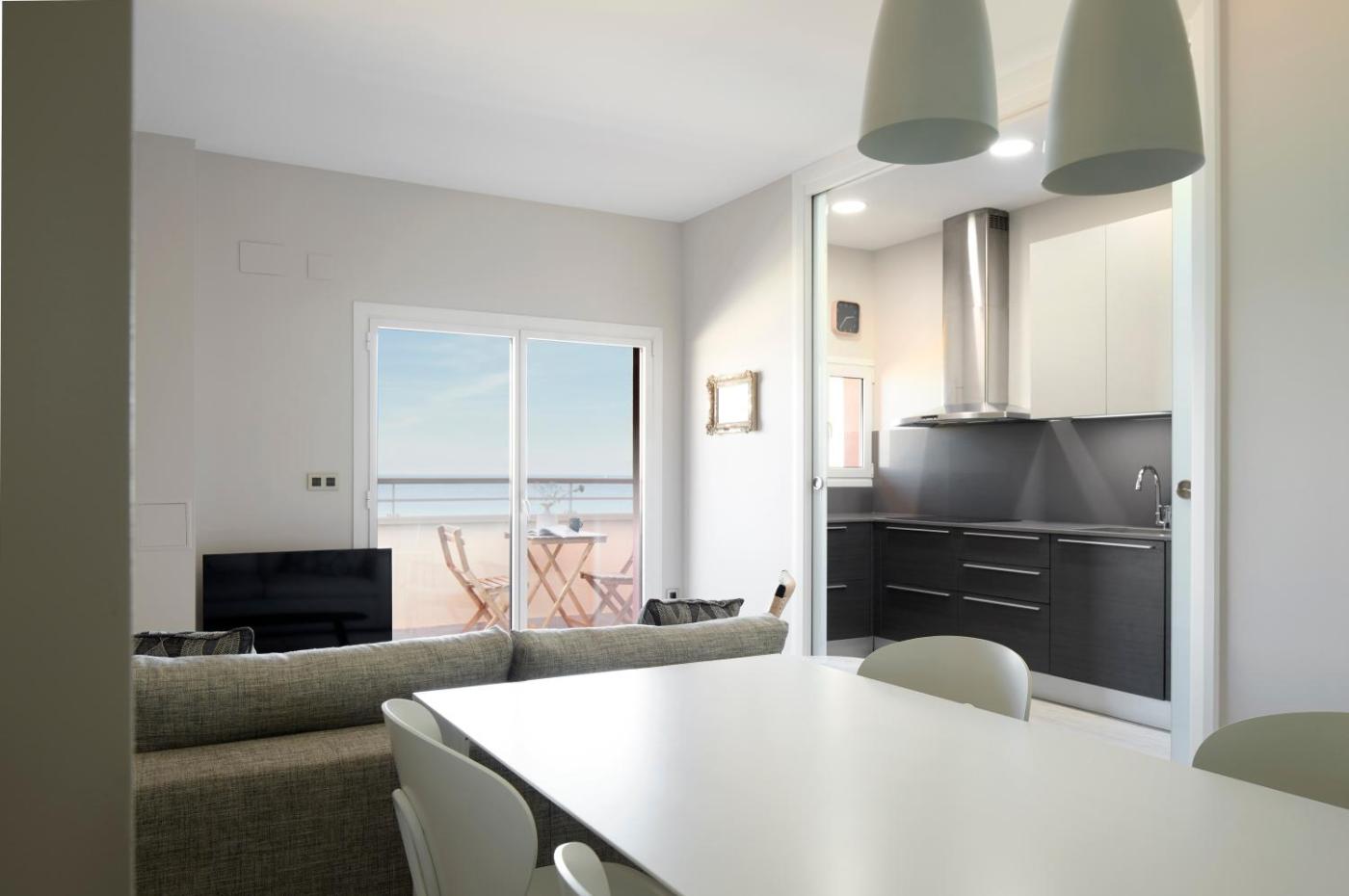 El apartamento cuenta con balcón y vistas al mar, y tiene 2 dormitorios, una sala de estar, TV de pantalla plana, una cocina equipada con nevera y lavavajillas, y 2 baños con ducha. Hay toallas y ropa de cama en el apartamento.
