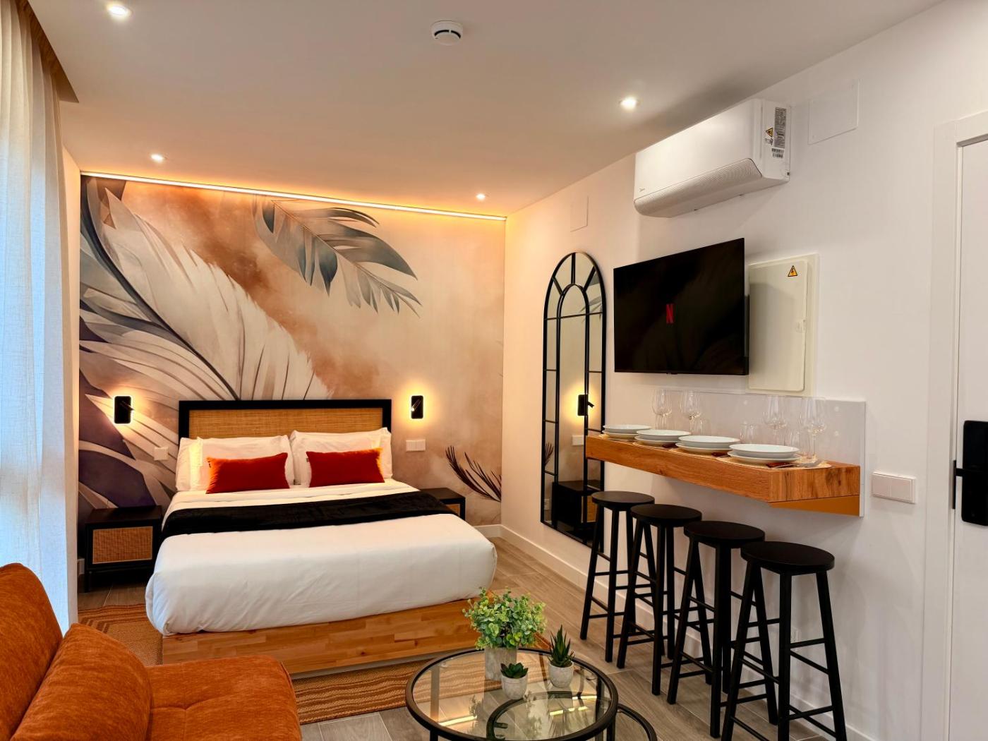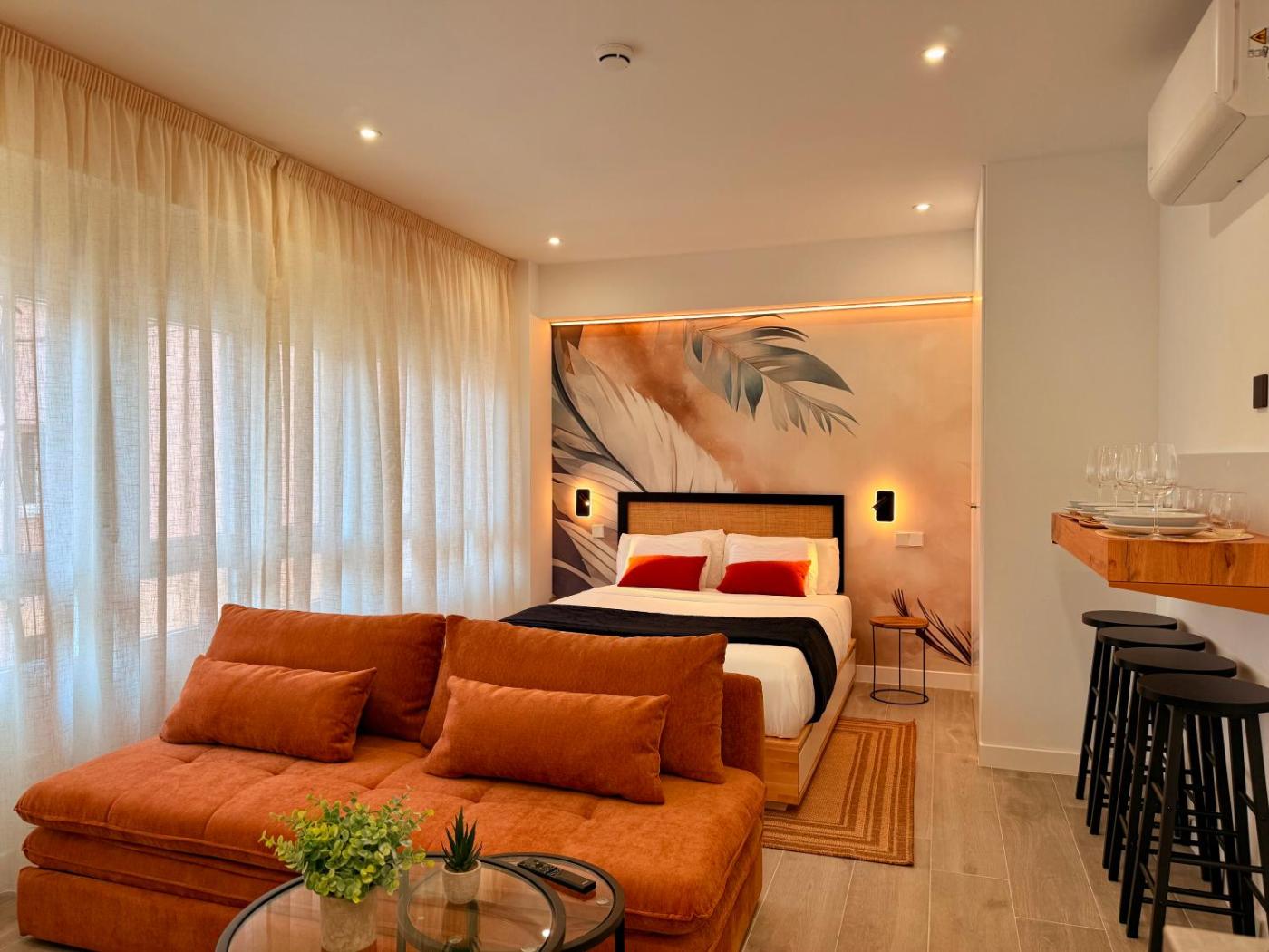 Estudio Deluxe. El estudio cuenta incluye baño privado con artículos de aseo gratuitos, ducha y secador de pelo. La cocina está bien equipada con fogón, nevera, utensilios y microondas. El estudio incluye aire acondicionado, zona de estar con TV de pantalla plana, lavadora, paredes insonorizadas, minibar, tetera y cafetera. La unidad cuenta con 2 camas. ;