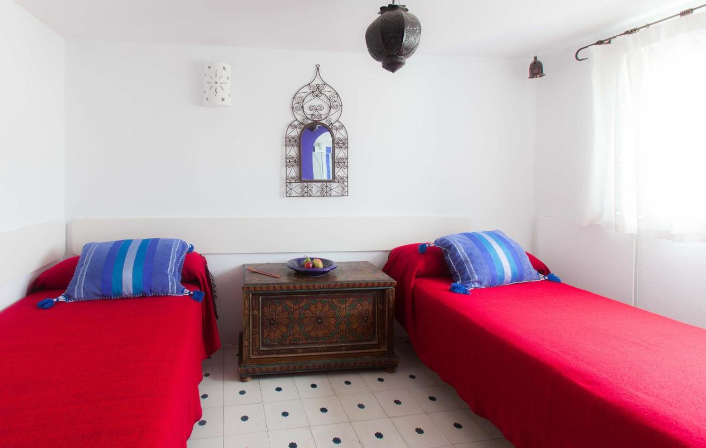 El Estrella de Tarifa está totalmente integrado en el entorno gracias a las paredes encaladas, los muebles marroquíes y los toques de color azul.